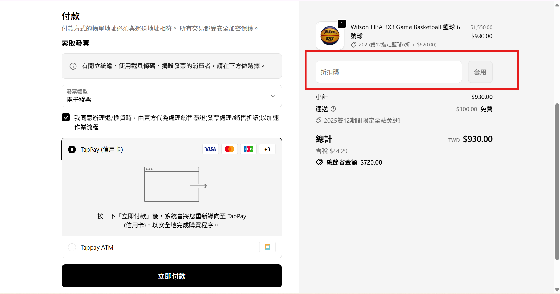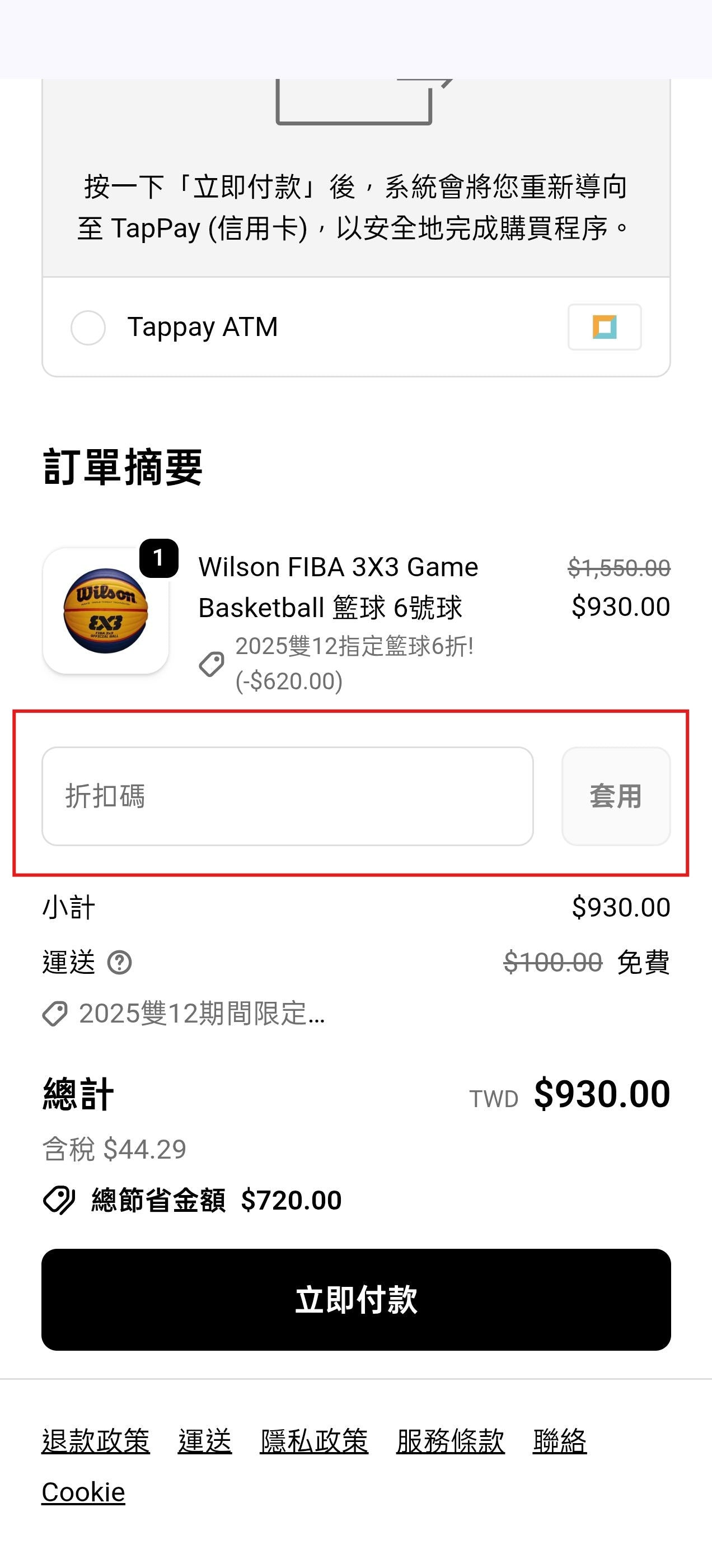 在折扣碼欄位貼上並點擊套用
